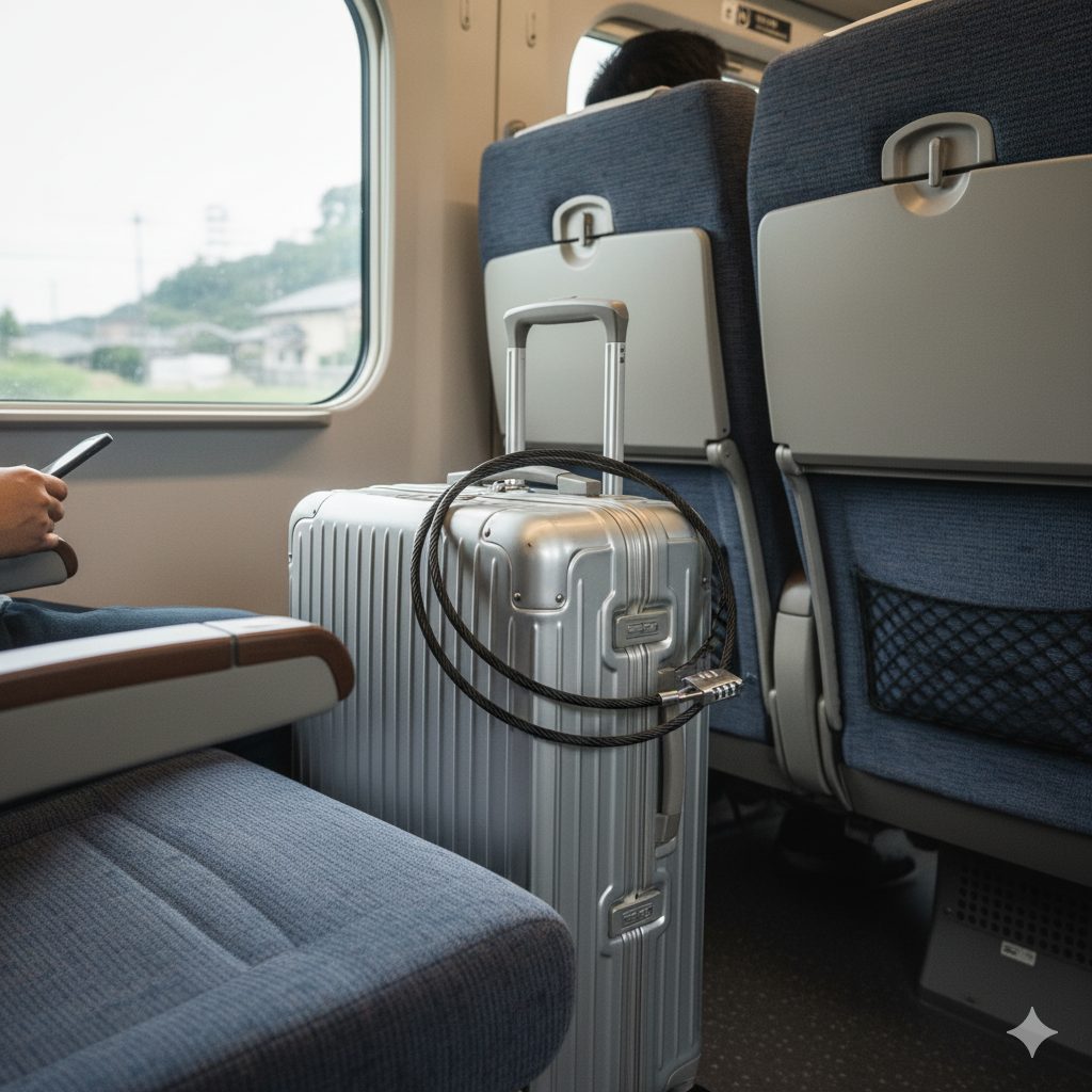 スーツケースを座席に残す際の最も有効な対策がワイヤーロックです。スーツケースの持ち手と、座席のアームレストや前の座席の網棚の支柱などをつないでロックします。