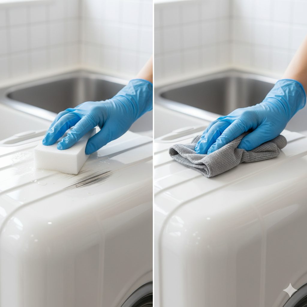 このような黒い汚れを落とすには、メラミンスポンジ(激落ちくんなど)を使用するのが非常に効果的です。メラミンスポンジは、水を含ませて軽く擦るだけで、洗剤を使わずに汚れを削り落とすことができます。