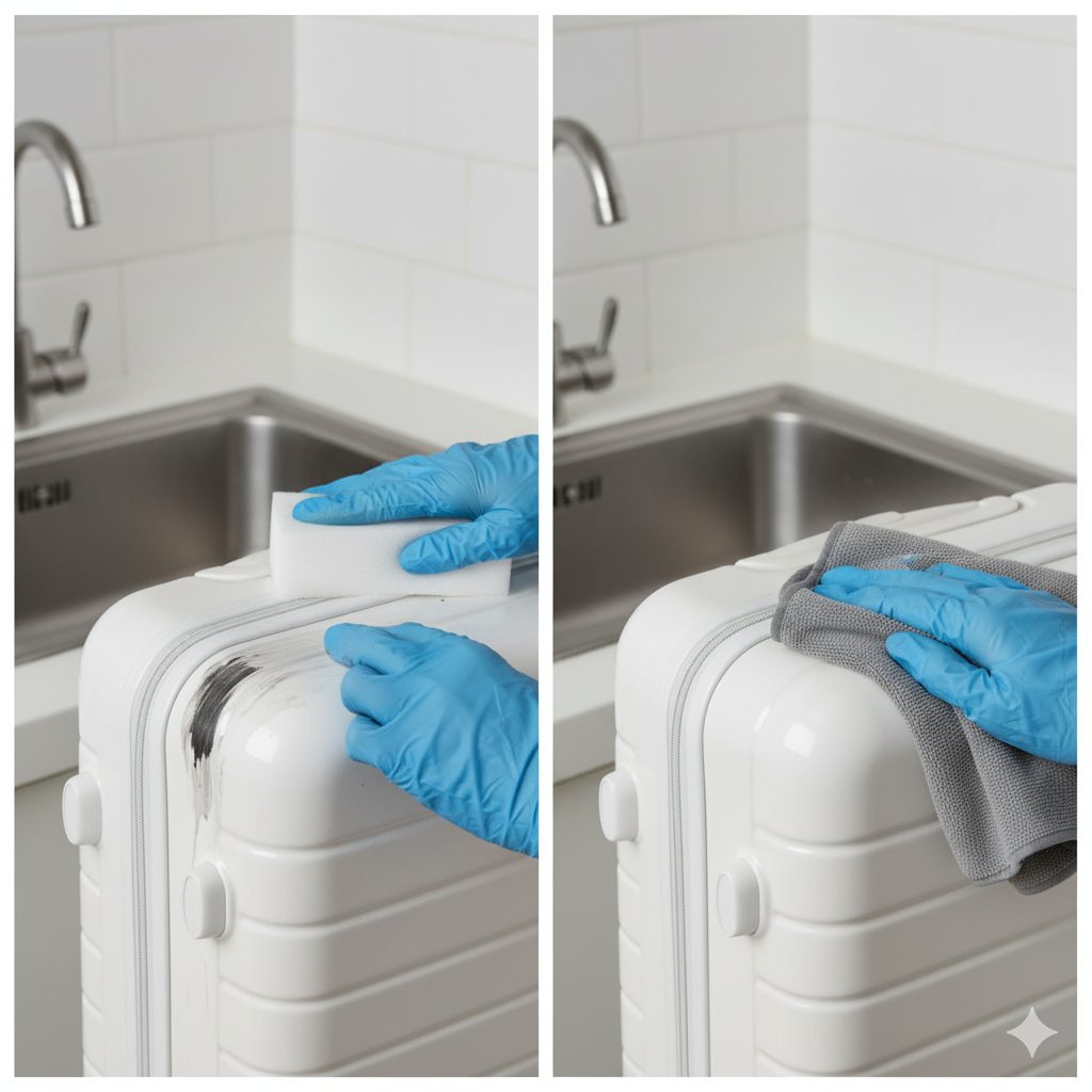 メラミンスポンジは研磨作用が強いため、強く擦りすぎるとスーツケースの表面のコーティングが剥がれたり、ツヤが失われたりする可能性があります。