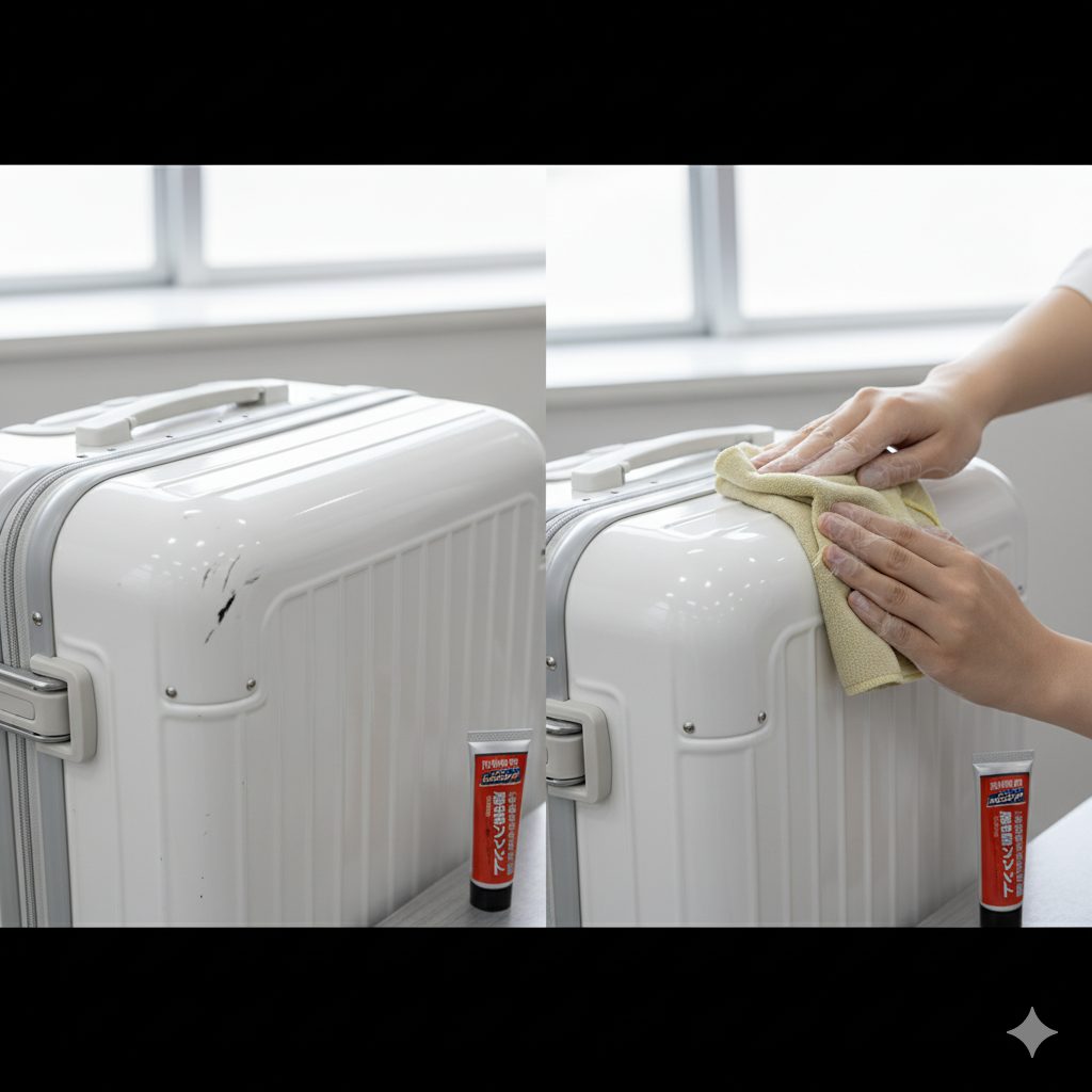 特に、鏡面加工(グロス仕上げ)のスーツケースに使用する際は、目立たない場所で試してから、ごく軽い力で作業するようにしてください。