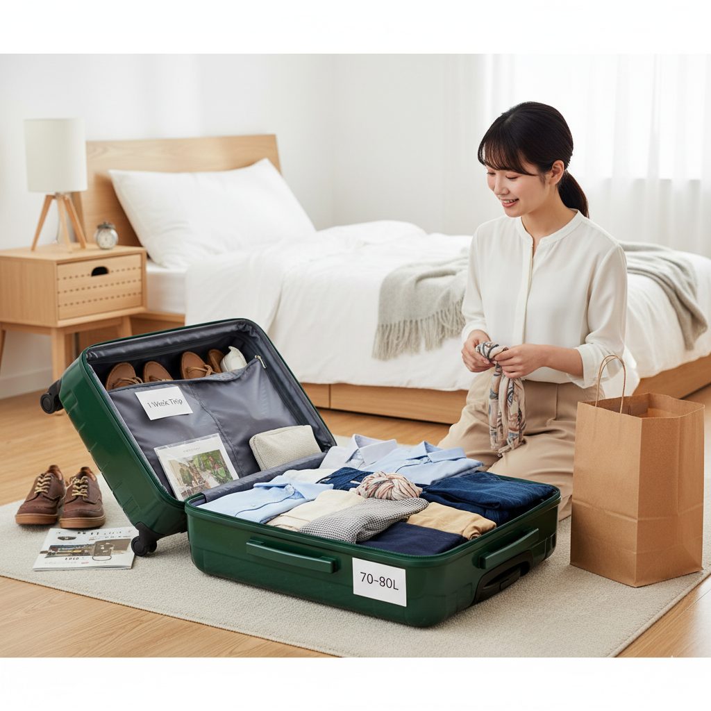 逆に、荷物をコンパクトにまとめるのが得意な方や、現地で洗濯をする予定の方は、目安より小さいサイズでも十分な場合があります。